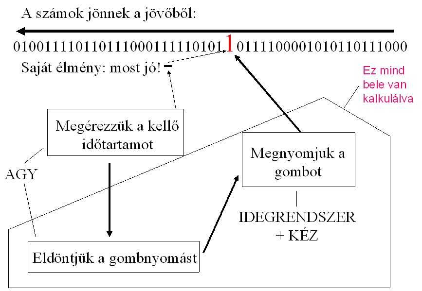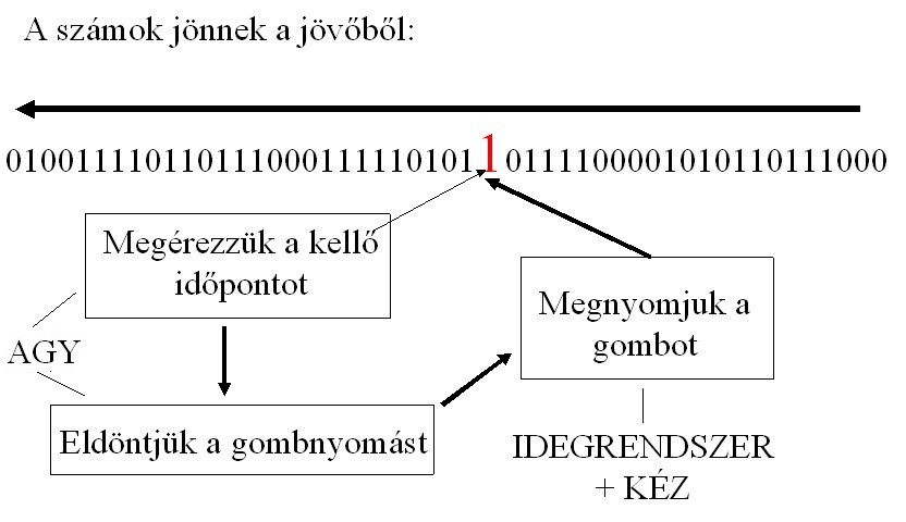 Gondoljuk végig részletesebben, mi történik itt. Ha feltételezzük, hogy a prekogníció magát a jövőben bekövetkező eseményt jelzi előre, akkor egy időzítési aktus lefolyását a 6.2. ábrával lehet szemléltetni: